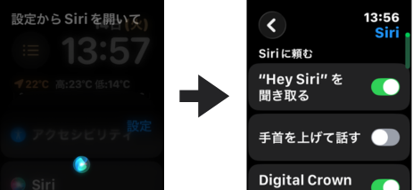「Hey Siri」と話しかけるか、Digital Crown(デジタル クラウン)を長押しする方法が安心です。