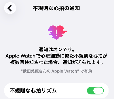 不規則なリズムが一定時間続いた場合に、Apple Watchに通知が届く状態になっています。
