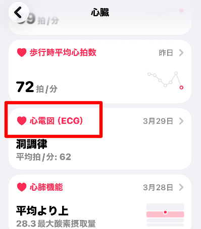 iPhoneの「ヘルスケア」アプリ →「ブラウズ」→「心臓」→「心電図(ECG)」