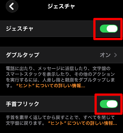 2.「ジェスチャ」と「手首フリック」をオンにします。