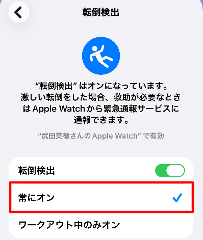 「転倒検出」を必ず「常にオン」にしておきましょう。